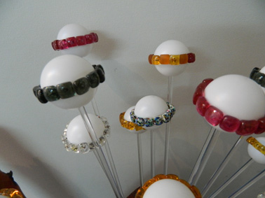 - Els protagonistes d'aquesta exposició són els botons, unes peces d'ús quotidià que la Victòria ha transformat hàbilment en obres d'art. A l'artista li agrada jugar amb diferents materials: roba, fusta, ceràmica, plàstic... Les seves obres suposen una reinvenció de l'espai del botó, ja que aquest està col·locat, d'una manera preconcebuda, sobre uns suports que ella mateixa ha modelat i que fa que el resultat de tot plegat siguin obres amb un valor artístic per si mateixes.