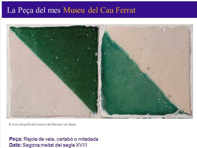 - El Consorci del Patrimoni de Sitges us proposa, aquest mes de febrer una rajola de mostra, que forma part de la Col·lecció de Santiago Rusiñol.L'autoria i presentació de la fitxa aniran a càrrec de la Dra. Marta Saliné Peça: Rajola de Vela, cartabó o mitadadaData: segona meitat del segle XVIII