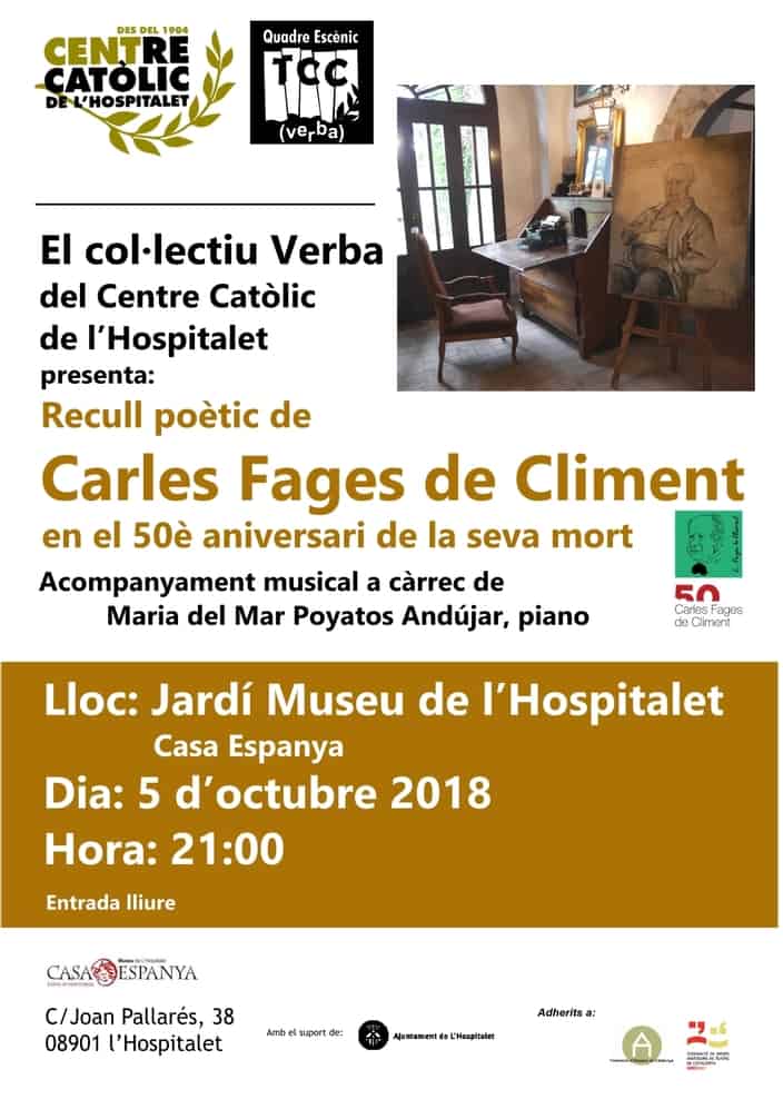 - El col·lectiu Verba del Centre Catòlica de l'Hospitalet presenta el recull poètic de Carles Fages de Climent en el 50è aniversari de la seva mort. Acompanyament musical a càrrec de Maria del Mar Poyatos Andújar al piano.