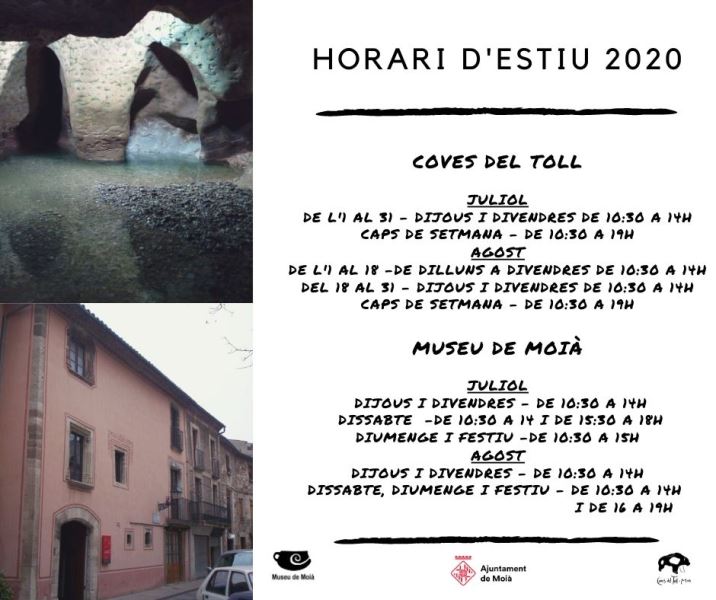- Degut a la situació post estat d'alarma, aquests mesos d'estiu, l'horari d'obertura de les Coves del Toll s'ha vist alterat. El del Museu es manté com sempre.