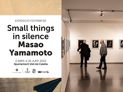 - Masao YamamotoSmall Things in SilenceAquesta exposició és una mostra antològica amb seixanta-quatre peces, en la qual es realitza un recorregut per 30 anys de carrera i es pot gaudir de les seves obres més emblemàtiques, integrades en cinc grans grups -A Box of Ku- -Nakazora- Kawa=Flow, -Shizuka i la més recent: Bonsai.Masao Yamamoto presenta un nou projecte que parteix de diverses obres dels seus treballs anteriors, un segell distintiu de la seva tasca des de les primeres exposicions. Mostra impressions en blanc i negre en un sol marc. Són escenes de naturalesa despoblada fetes al Japó. El títol de la sèrie fa referència al viatge del present al futur, d'una situació concreta a allò desconegut que s'acosta.Aquest treball més nou i audaç mostra matisos incrustats a l'estructura pictòrica. Ja sigui una imatge gràfica inspirada en la Bauhaus amb cables elèctrics que s'estenen telescòpicament de lluny (1549) o una delicada cadena muntanyosa coberta de núvols, s'enfoca així als valors atemporals, continguts en l'apreciació de la bellesa del nostre entorn.La seva formació com a pintor li va permetre desenvolupar el seu propi llenguatge visual, basat en agrupacions de petits detalls i moments. És la seva firma més contundent que emergeix a les seves fotografies més recents.De totes les imatges que ha pres, cap no té una identitat en termes de títol; cada peça està numerada, però forma part d'una sèrie contínua. Com una comunitat, les imatges són independents entre si; però, alhora, parteixen d'un col·lectiu.